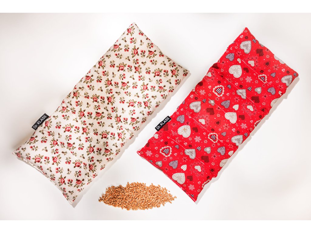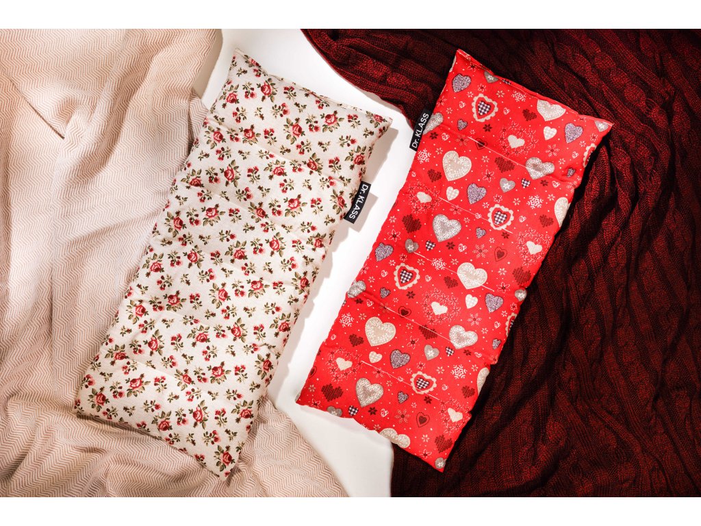 Sada obsahuje: 1 ks hrejivý vankúš Perníkové srdcia (červený) a 1 ks hrejivý vankúš Anglická ruža (biely)
